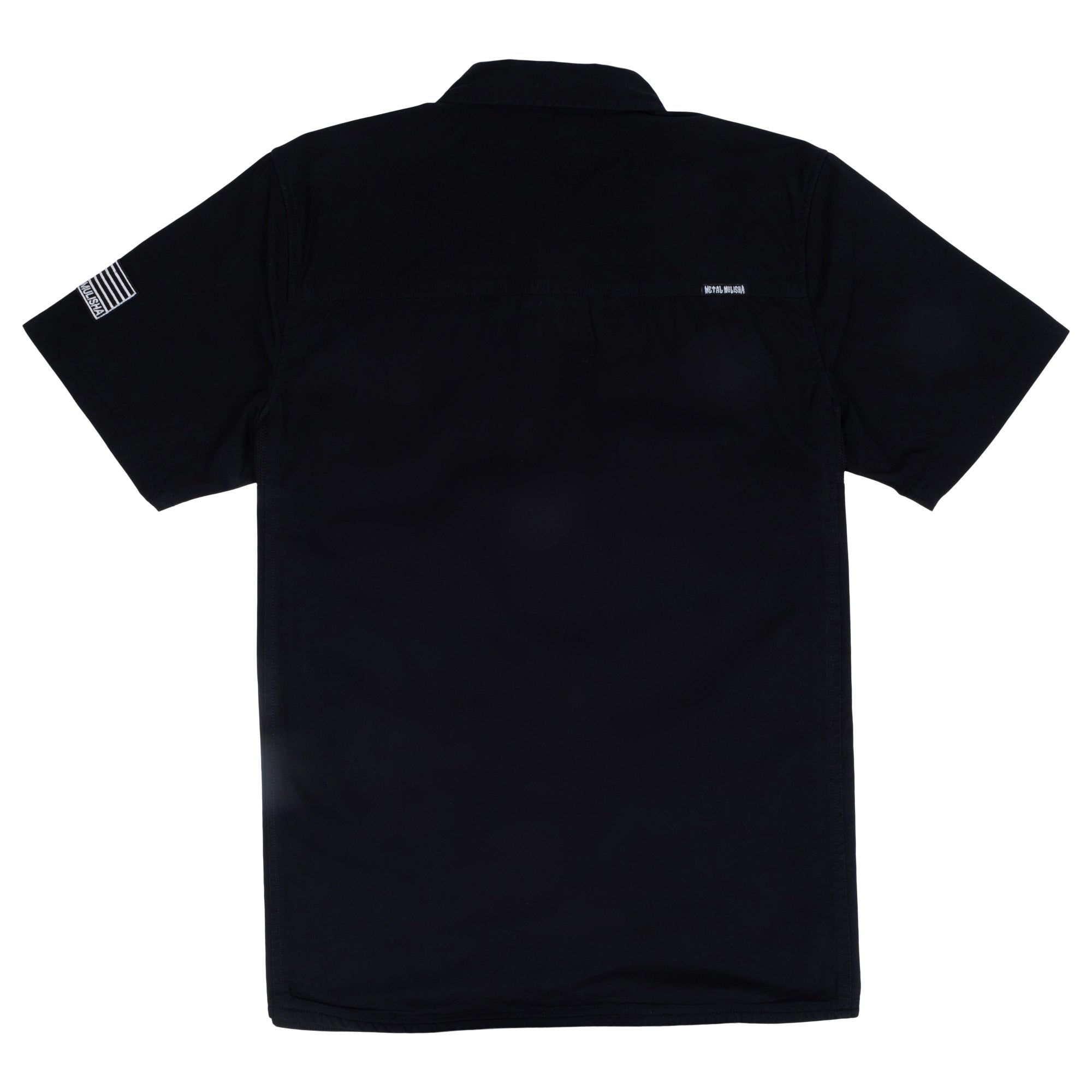 The Pits Woven Short Sleeve Collared Work Shirt in Black is a custom button up shirt that features a heavy duty material, mesh under armpits for breathability, custom Metal Mulisha buttons, patch on the front right of the shirt and the left sleeve, M/M woven label on back seam, and 2 front pockets with buttons. 100% Cotton