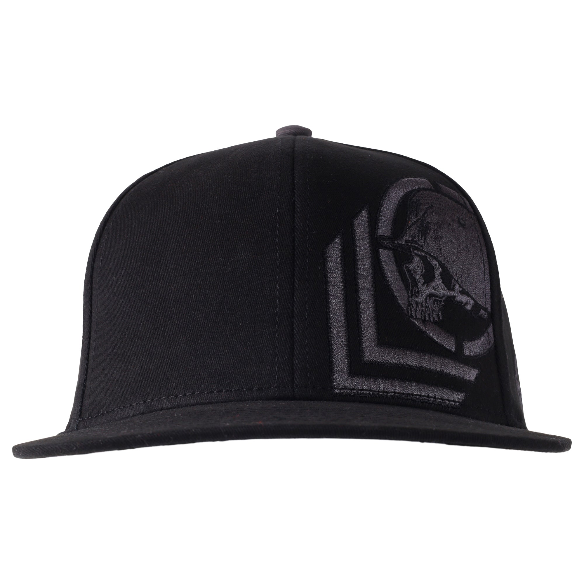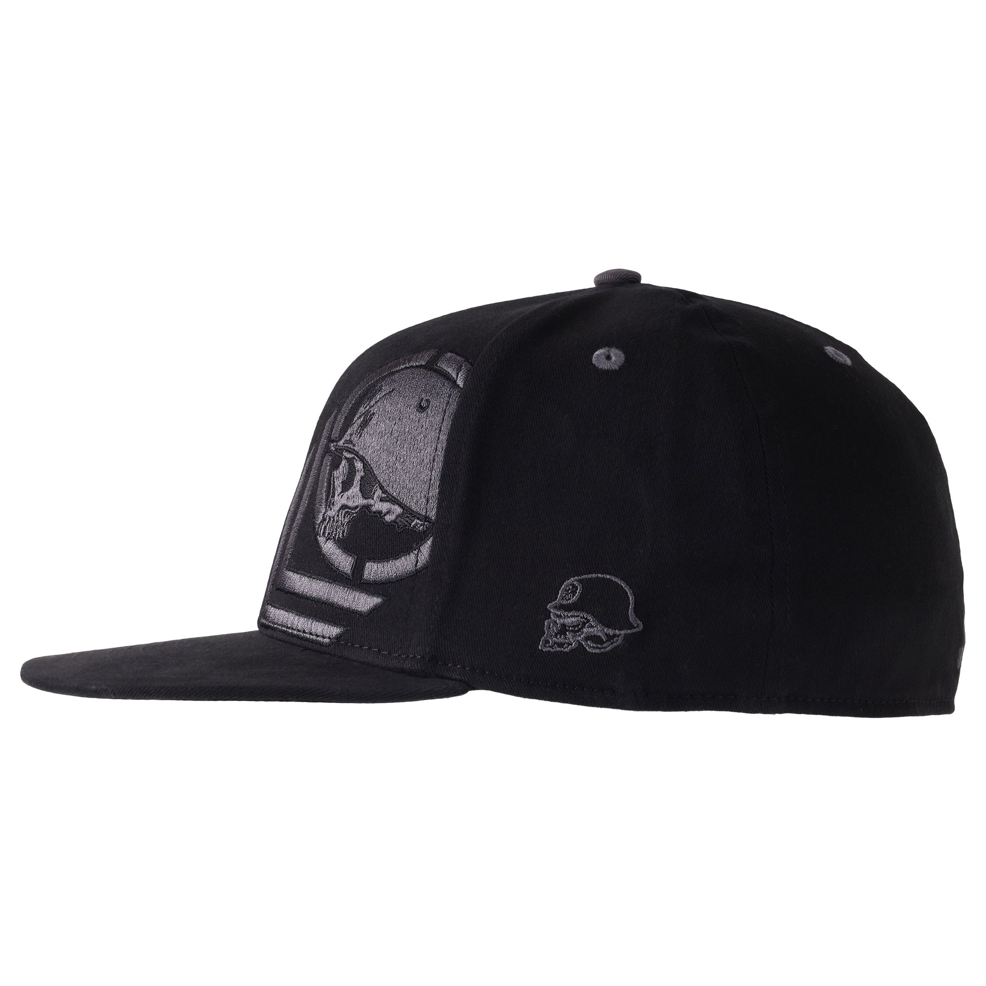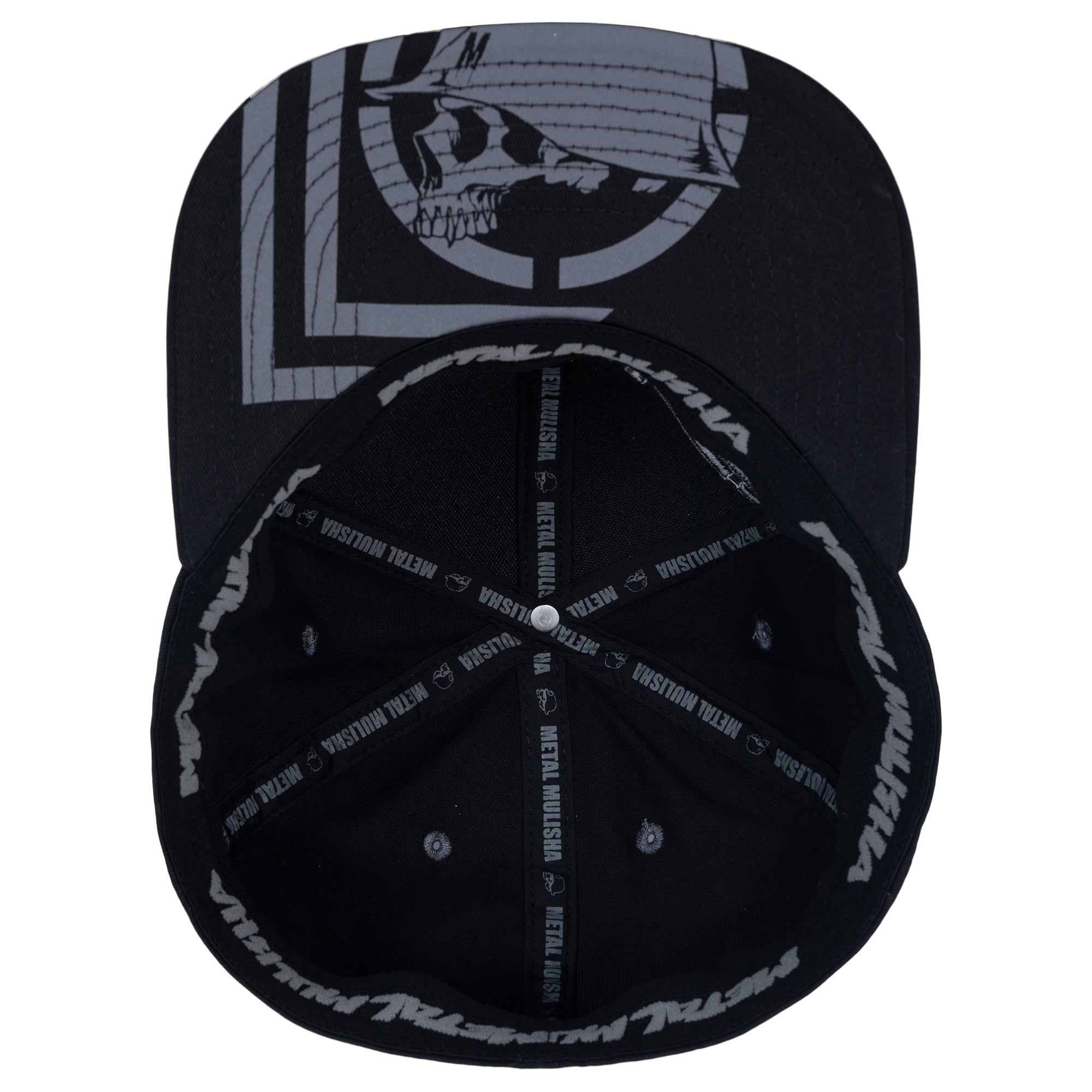 The Metal Mulisha Sketched Flex Hat in Black features a large Metal Mulisha Chevron logo embroidery in grey, small Metal Mulisha logo embroidery on back center and helmet logo on left side, large M/M underbill print, and custom printed internal seam taping. Flat bill with ability to curve.