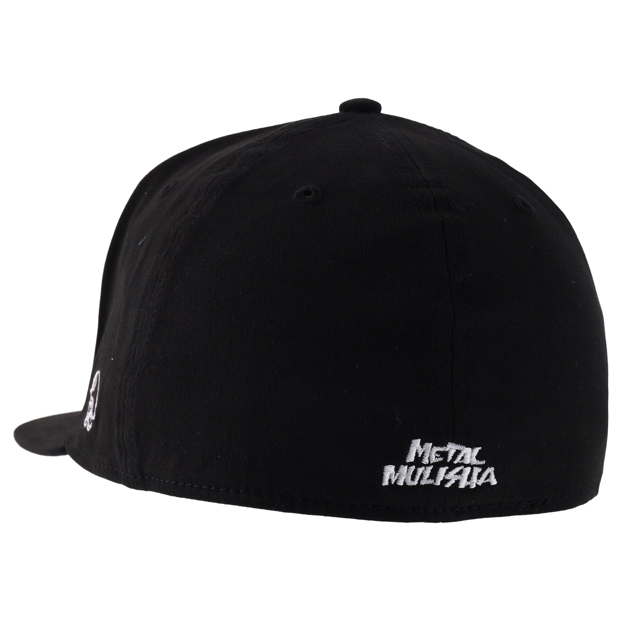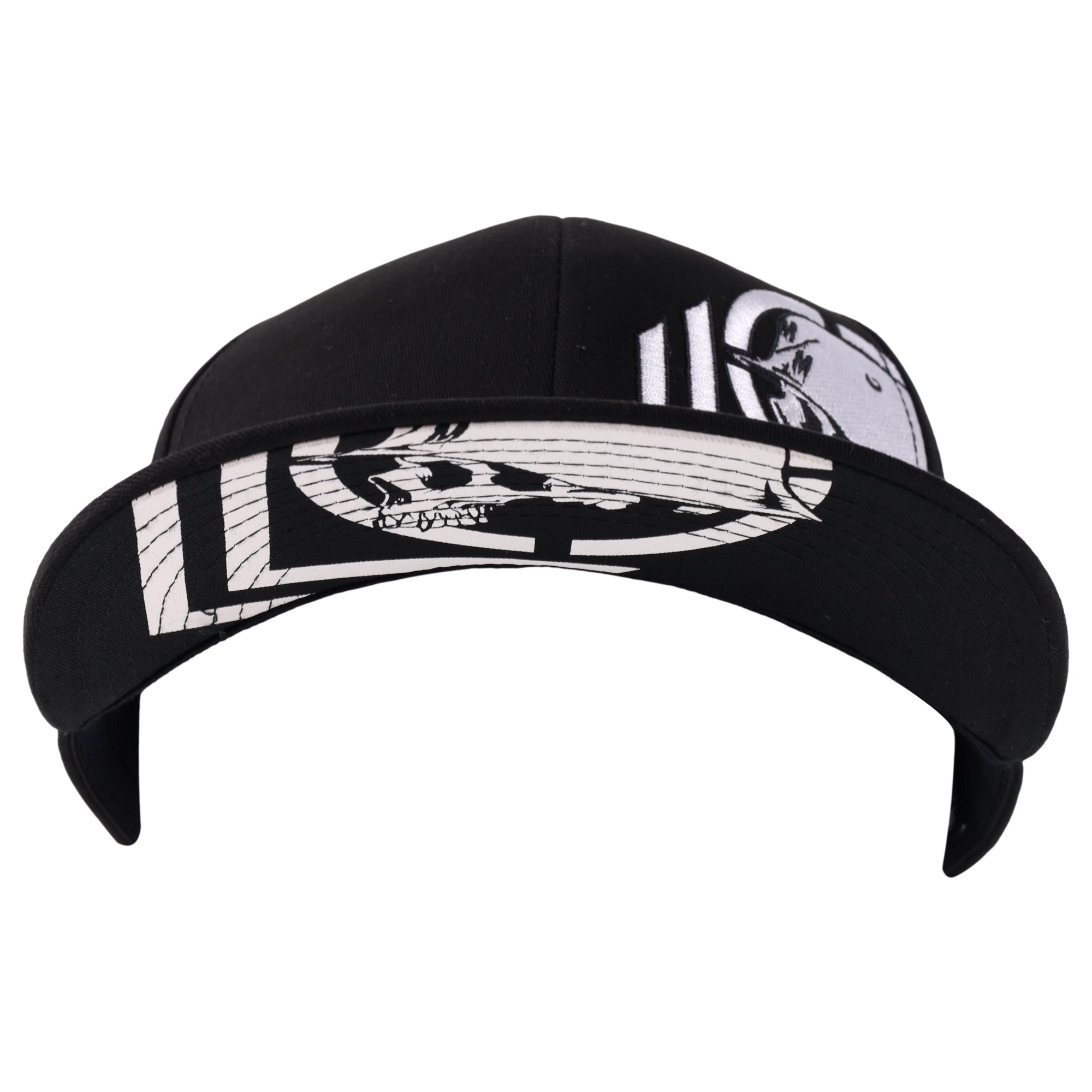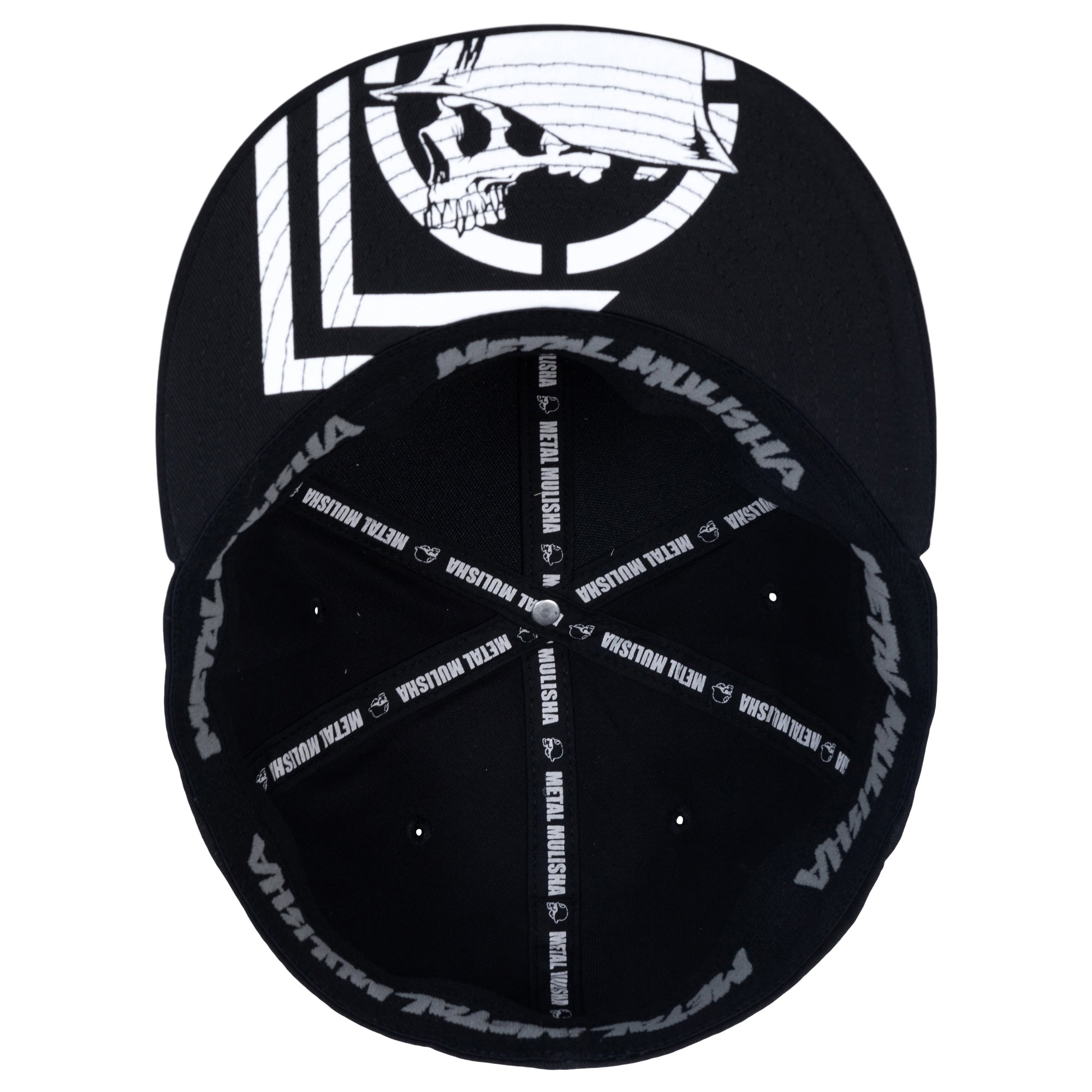 The Metal Mulisha Sketched Flex Hat in Black features a large Metal Mulisha Chevron logo embroidery in White, small Metal Mulisha logo embroidery on back center and helmet logo on left side, large M/M under bill print, and custom printed internal seam taping. Flat bill with ability to curve. 98% Cotton, 2% Spandex