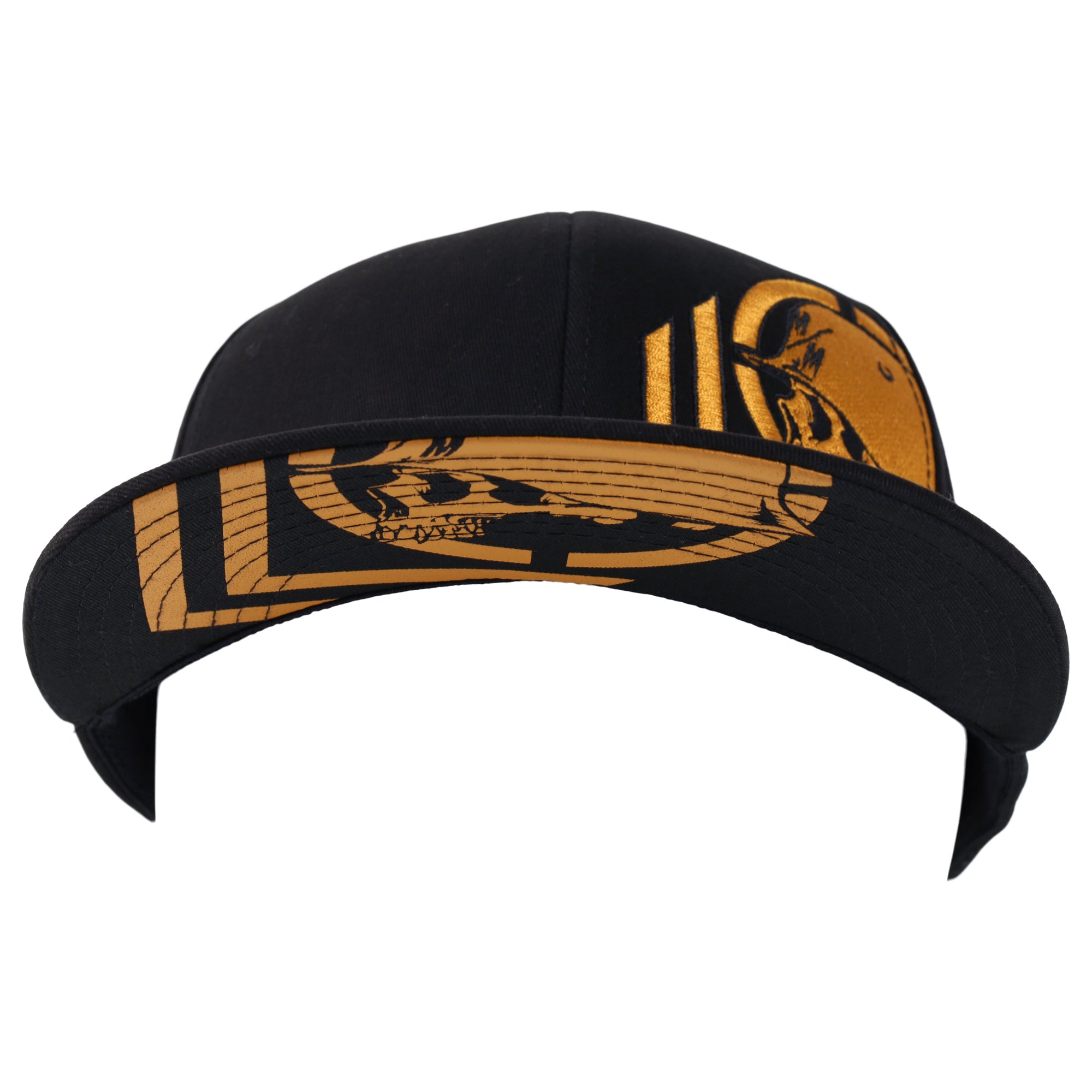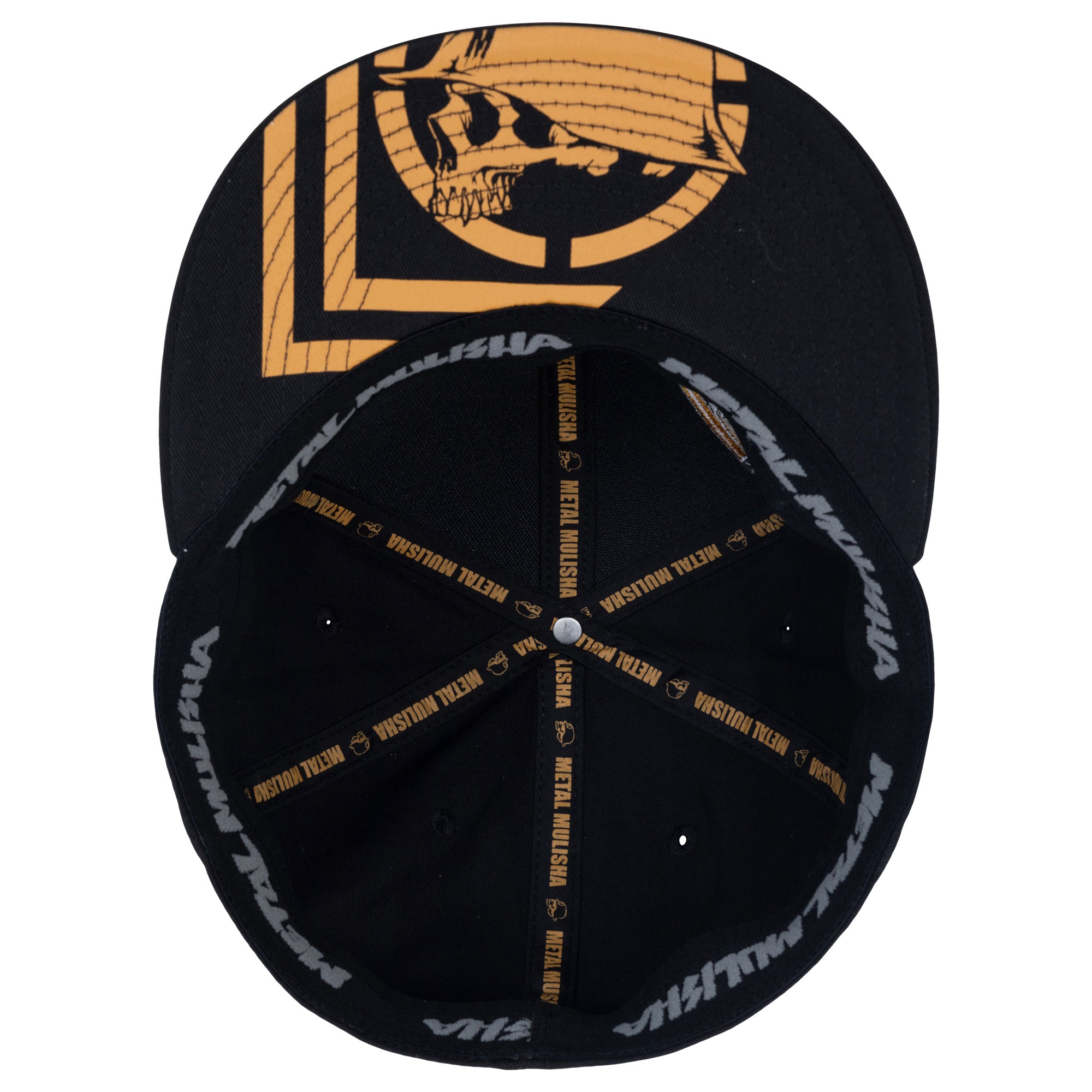 The Metal Mulisha Sketched Flex Hat in Black features a large Metal Mulisha Chevron logo embroidery in Gold, small Metal Mulisha logo embroidery on back center and helmet logo on left side, large M/M under bill print, and custom printed internal seam taping. Flat bill with ability to curve. 98% Cotton, 2% Spandex
