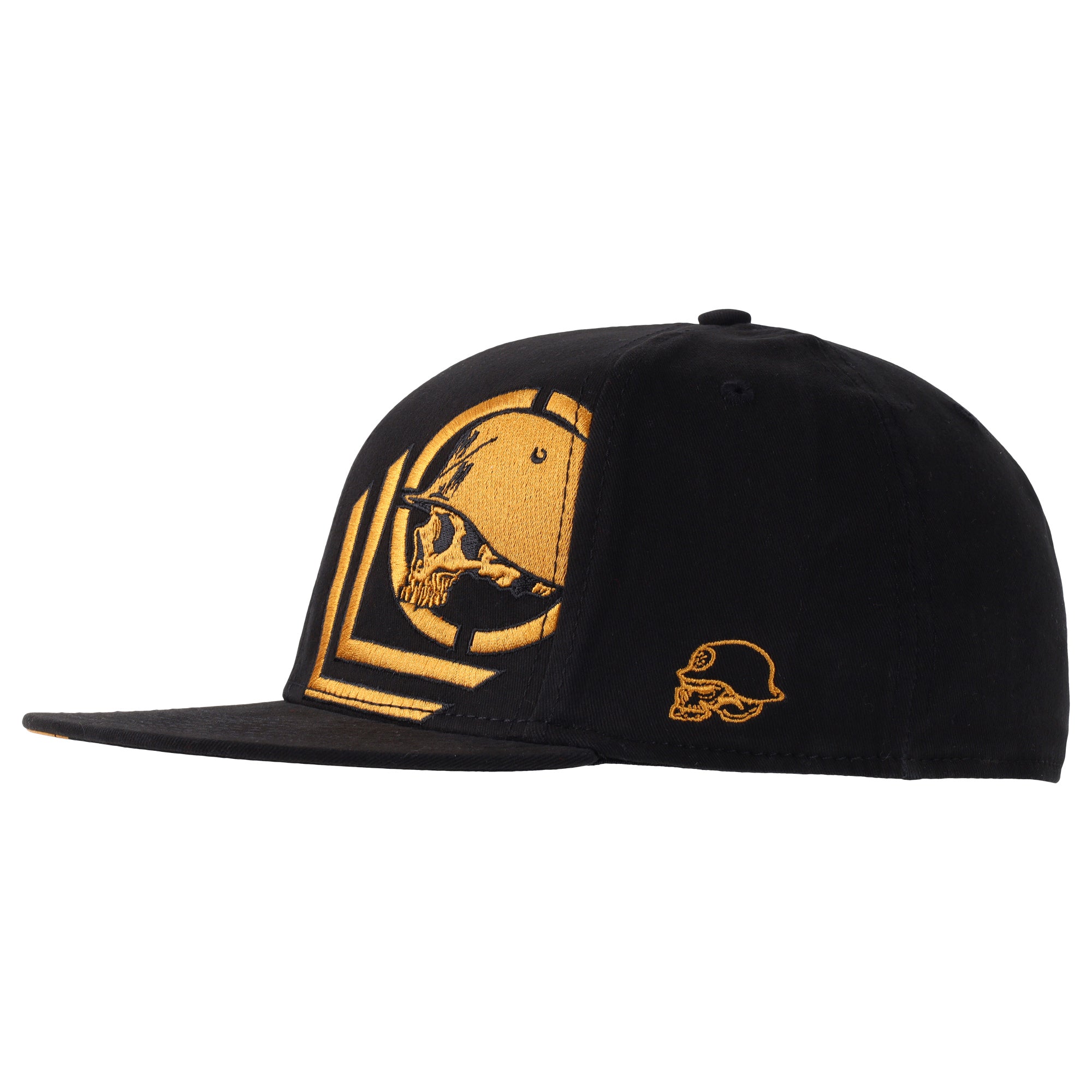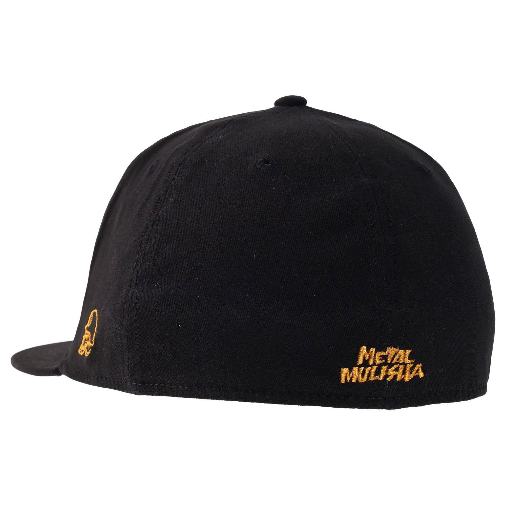 The Metal Mulisha Sketched Flex Hat in Black features a large Metal Mulisha Chevron logo embroidery in Gold, small Metal Mulisha logo embroidery on back center and helmet logo on left side, large M/M under bill print, and custom printed internal seam taping. Flat bill with ability to curve. 98% Cotton, 2% Spandex