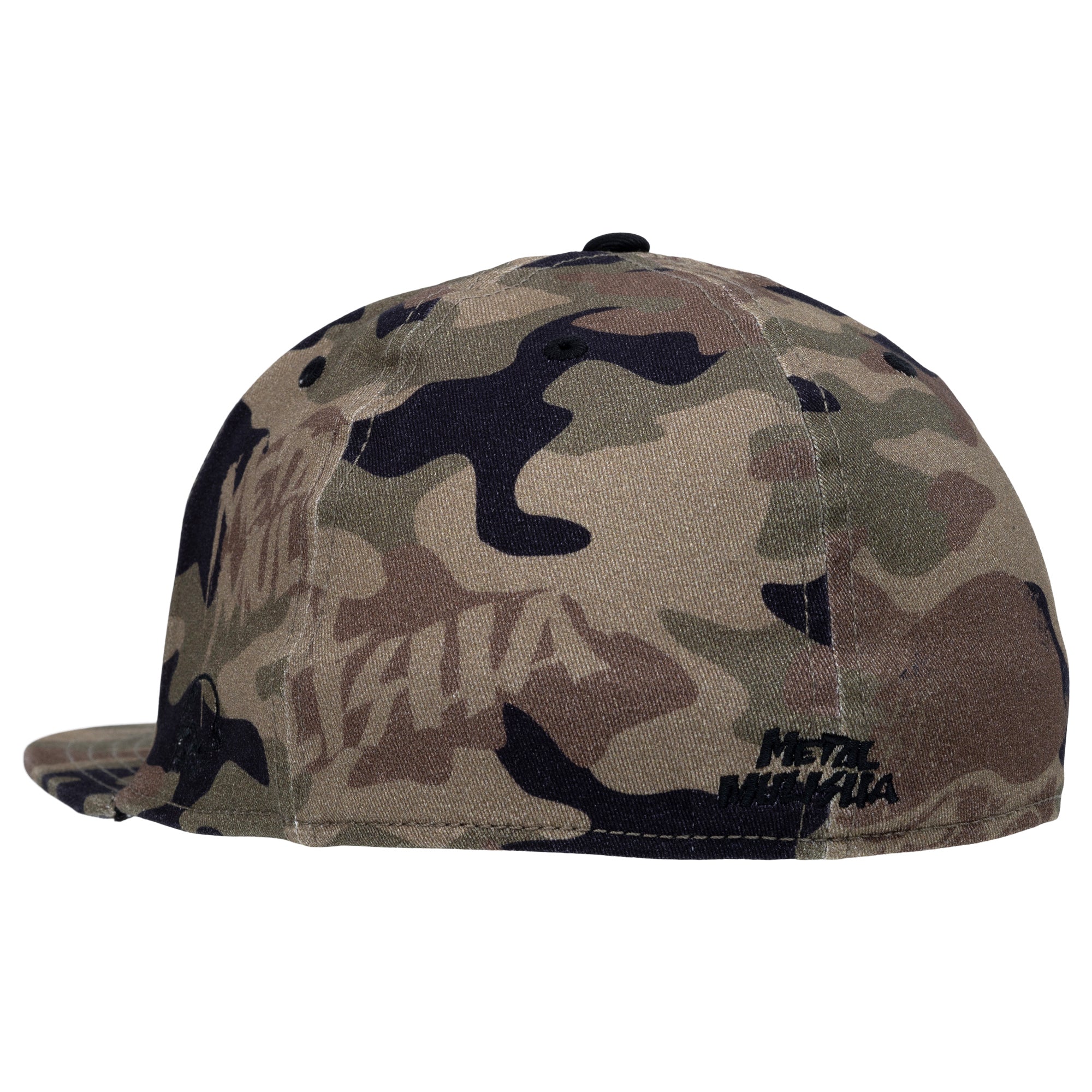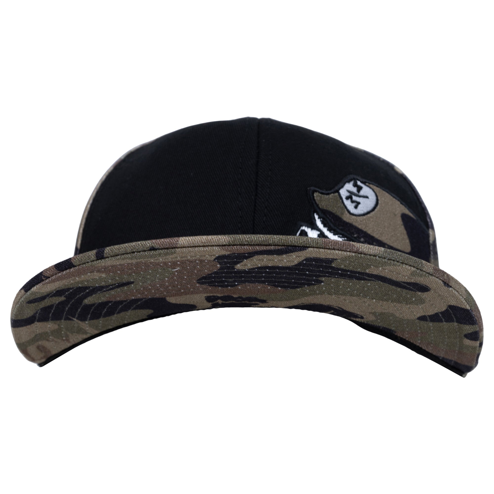 The Sky High Flex Hat in Camo features a large skull embroidery on the left front panel in camo, custom printed underbill, custom sweatband, all over camo print on back panels, small skull on left side in Black and Metal Mulisha logo on back in Black.