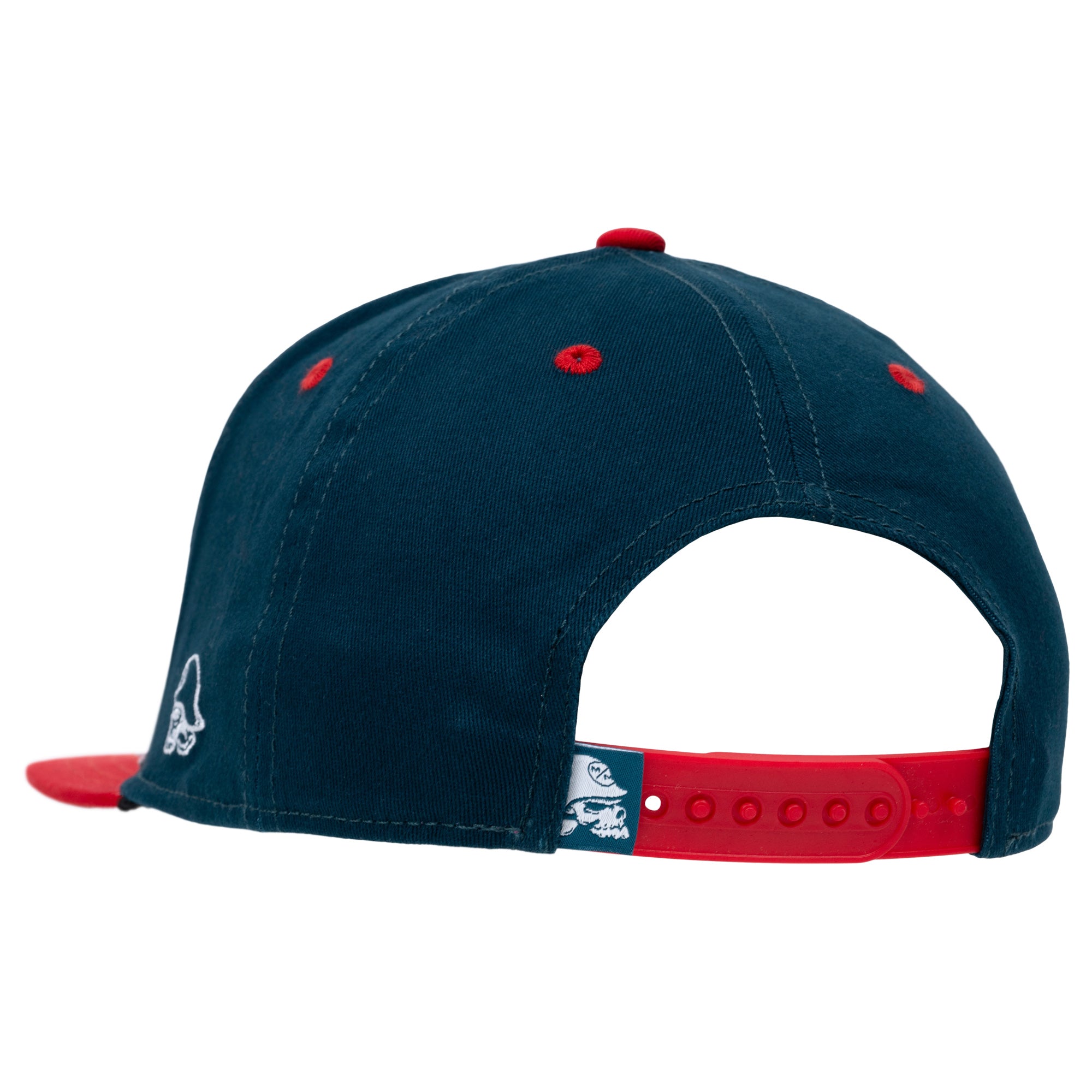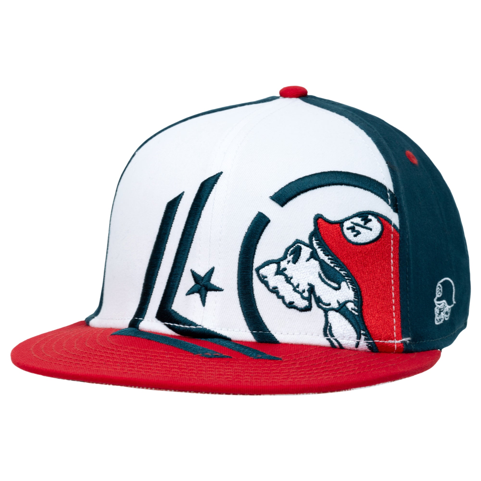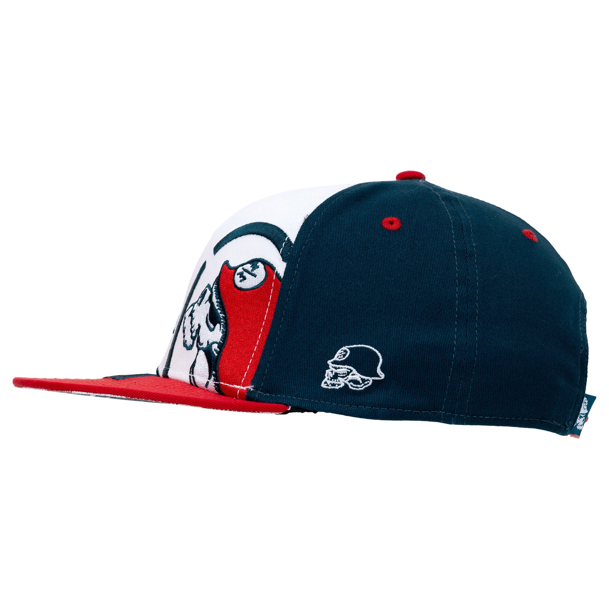 The Staple Snapback Hat in Red, White and Blue features a large embroidered Metal Mulisha skull with chevrons with a scope on the front in Red and Blue, a custom underbill print of an American Flag, a small white helmet logo on the left side panel, and a Red comfortable Flexsnap band with a small custom woven label.