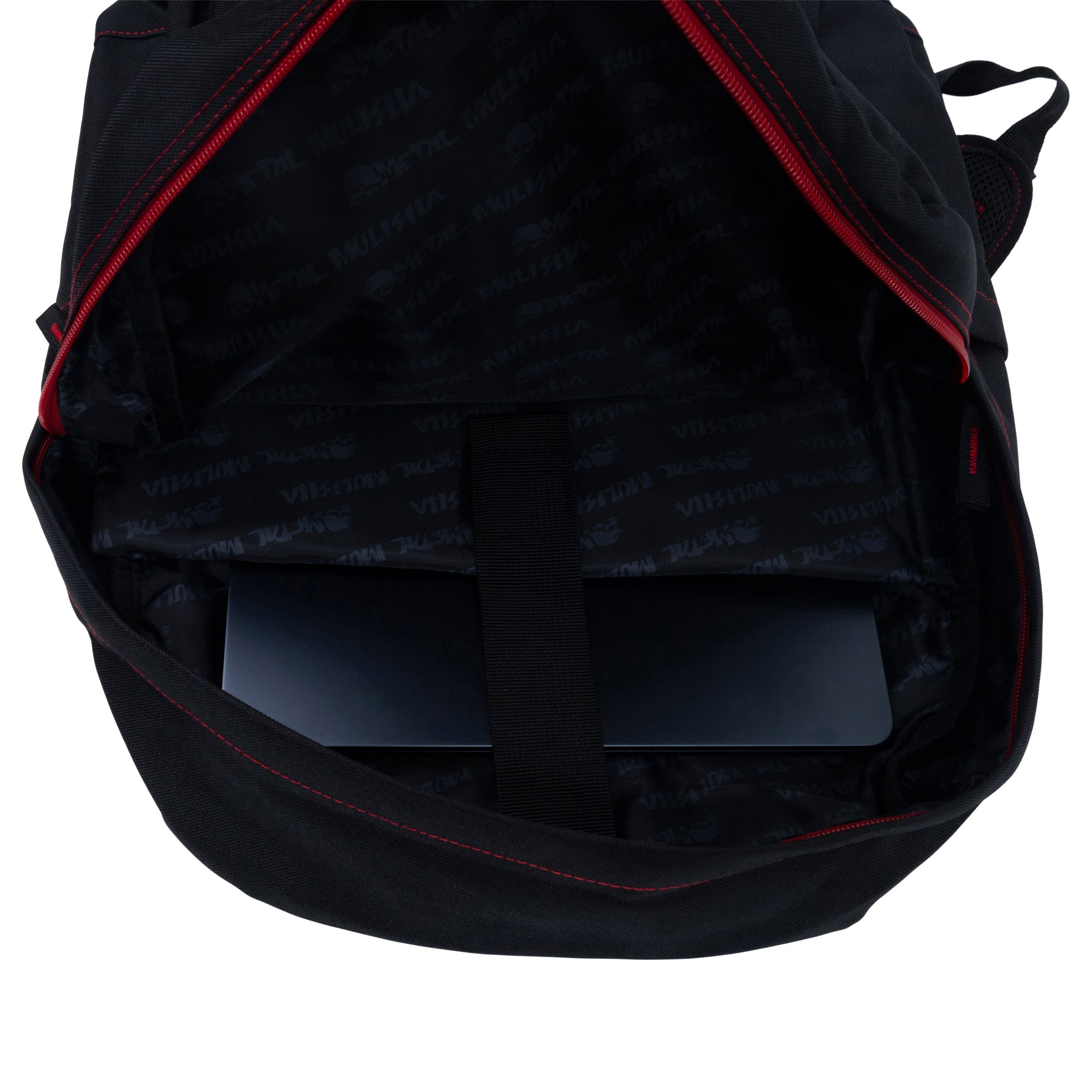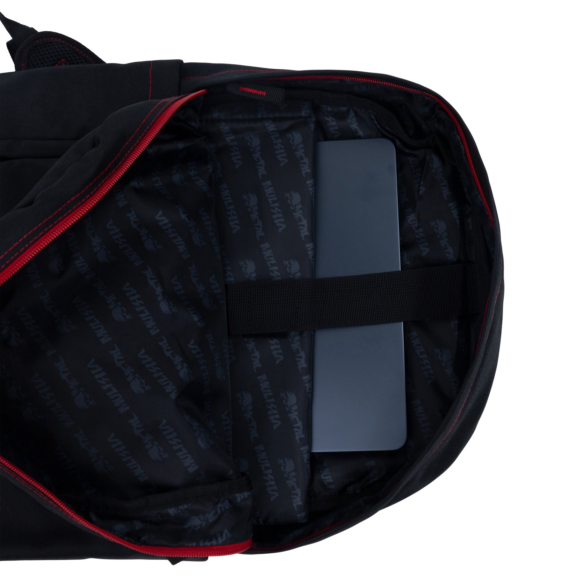 The Trooper Backpack in Black features Red stitching along the backpack, a Metal Mulisha OG skull patch on the front and a woven label on the front pocket, and a custom red zipper.
